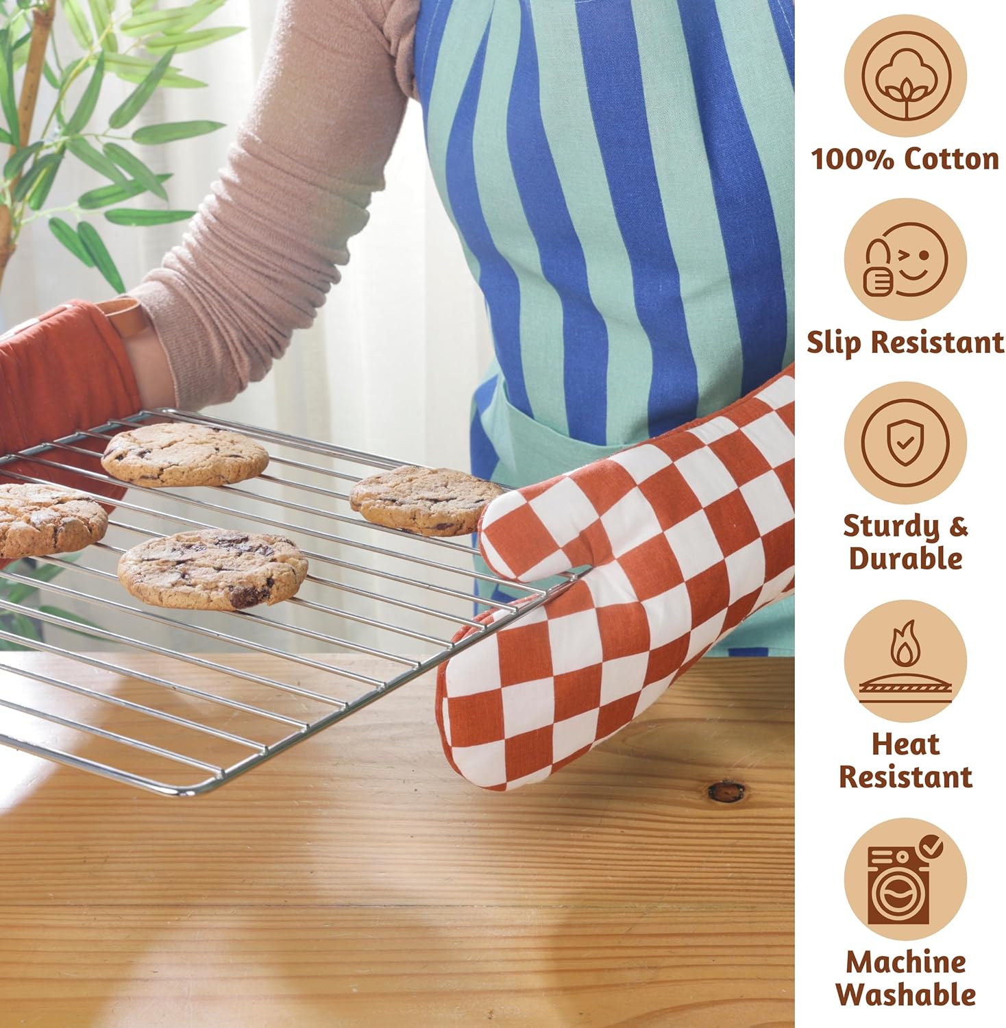 - [ NON SLIP SILICON GRIP ] - The gloves for cooking are crafted with a silicon layering that gives them a firm & secure grip while handling pots and pans. The waterproof silicone material is not affected by steam or hot liquids. The silicon in the oven mits/glove set is food grade & BPA free.