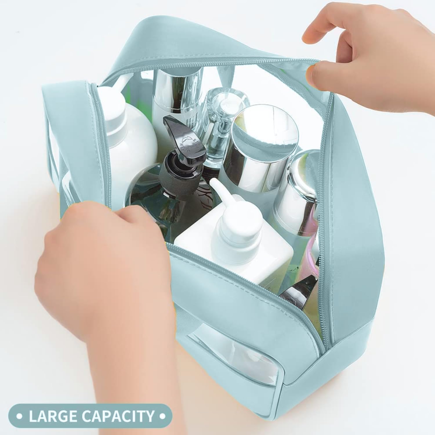 - HIGH QUALITY : The transparent design on both sides is made of 0.5 PVC plastic, and the surrounding is made of waterproof polyester fabric, which is sturdy and easy to clean. The reinforced seams prevent the bag from tearing easily. Each cosmetic bag is equipped with a high-quality metal zipper, durable and smooth